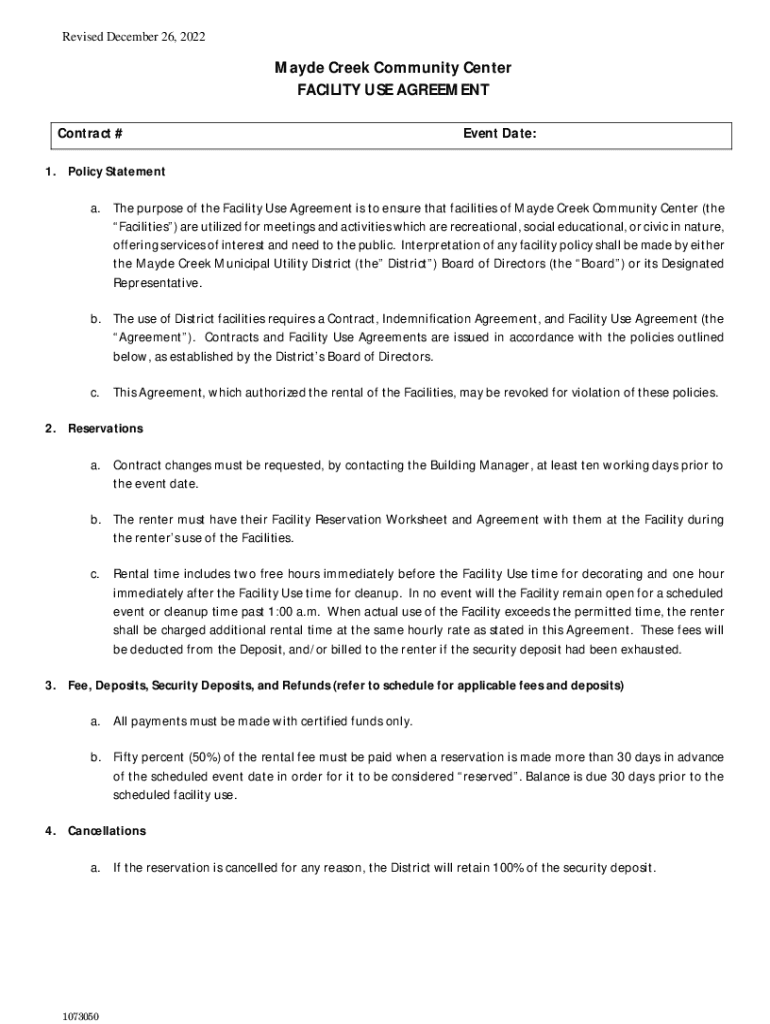 Revised December 26, 2022Mayde Creek Community Center FACILITY USE AGREEMENT Contract #Event Date:1. Policy Statement a. The purpose of the Facility Use Agreement is to ensure that facilities of Made