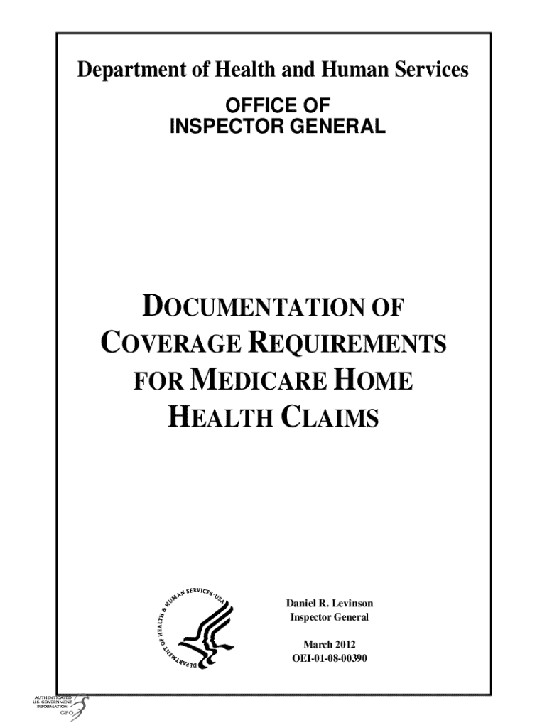Department of Health and Human Services OFFICE OF INSPECTOR GENERALDOCUMENTATION OF COVERAGE REQUIREMENTS FOR MEDICARE HOME HEALTH CLAIMSDaniel R. Levinson Inspector General March 2012 OEI010800390EXECUTIVE