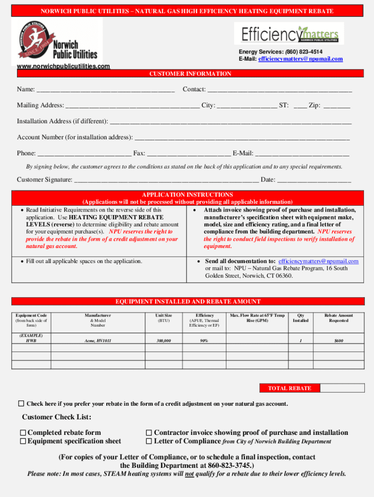 NORWICH PUBLIC UTILITIES NATURAL GAS HIGH EFFICIENCY HEATING EQUIPMENT REBATEEnergy Services: (860) 8234514 Email: efficiencymatters@npumail.comwww.norwichpublicutilities.com CUSTOMER Informational: