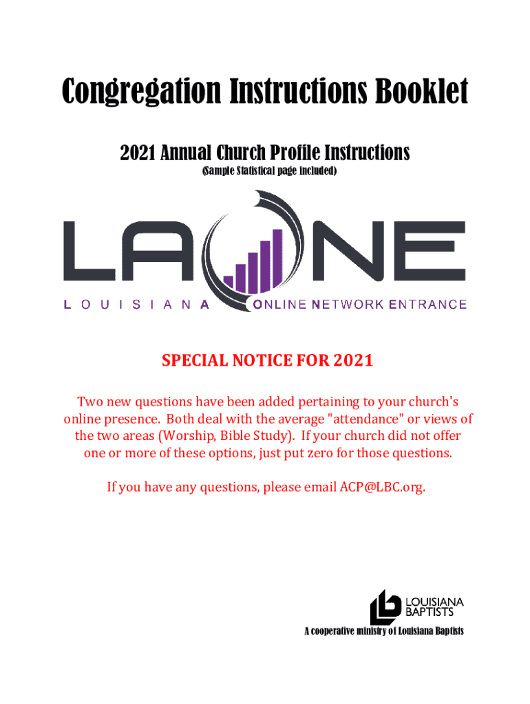 Congregation Instructions Booklet 2021 Annual Church Profile Instructions (Sample Statistical page included)SPECIAL NOTICE FOR 2021 Two new questions have been added pertaining to your church\'s online