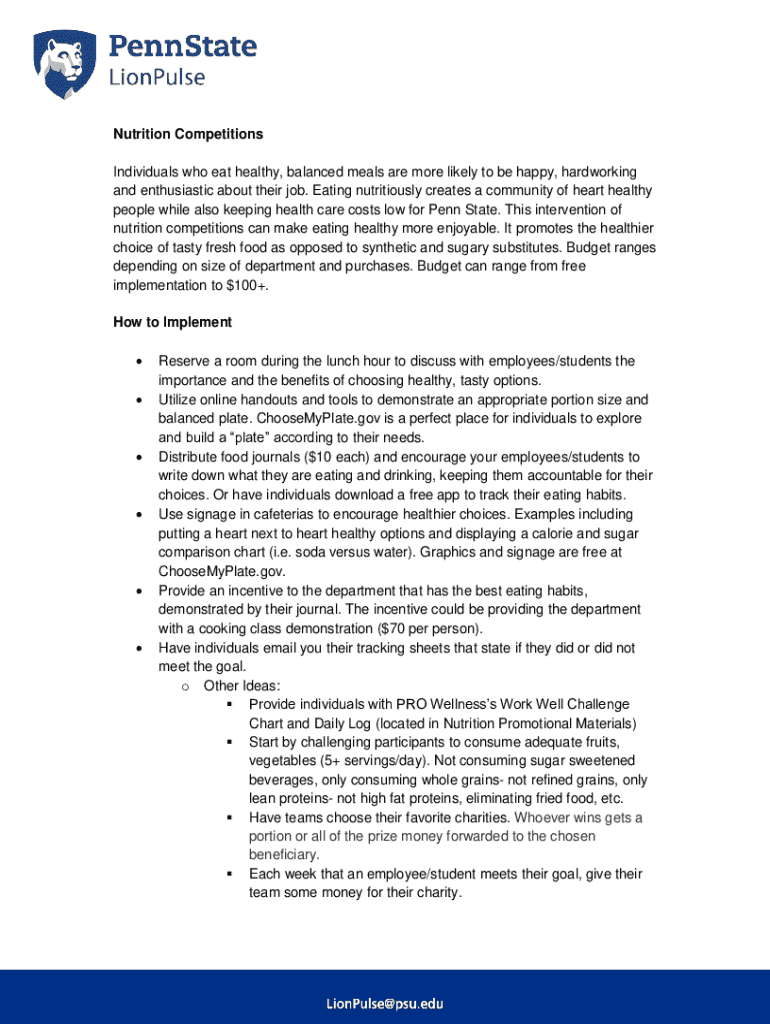 Nutrition Competitions Individuals who eat healthy, balanced meals are more likely to be happy, hardworking and enthusiastic about their job. Eating nutritiously creates a community of heart healthy