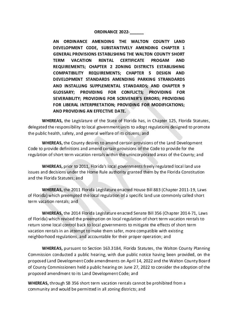 ORDINANCE 2022___ AN ORDINANCE AMENDING THE WALTON COUNTY LAND DEVELOPMENT CODE, SUBSTANTIVELY AMENDING CHAPTER 1 GENERAL PROVISIONS ESTABLISHING THE WALTON COUNTY SHORT TERM VACATION RENTAL CERTIFICATE