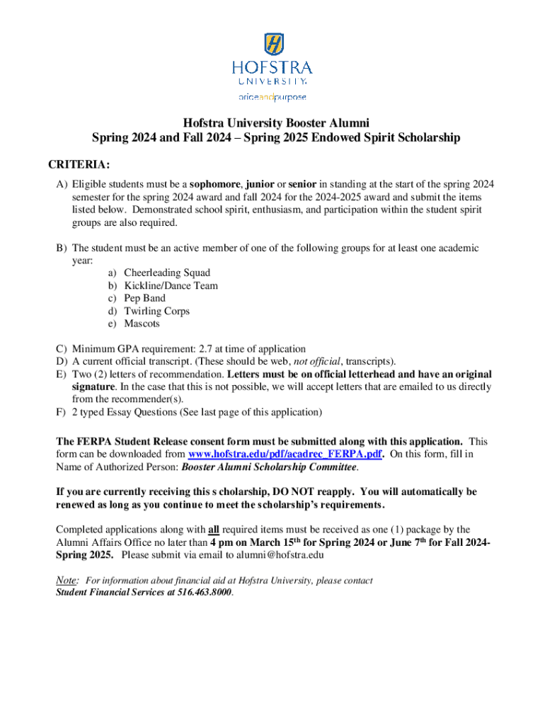 Hofstra University Booster Alumni Spring 2024 and Fall 2024 Spring 2025 Endowed Spirit Scholarship CRITERIA: A) Eligible students must be a sophomore, junior or senior in standing at the start of