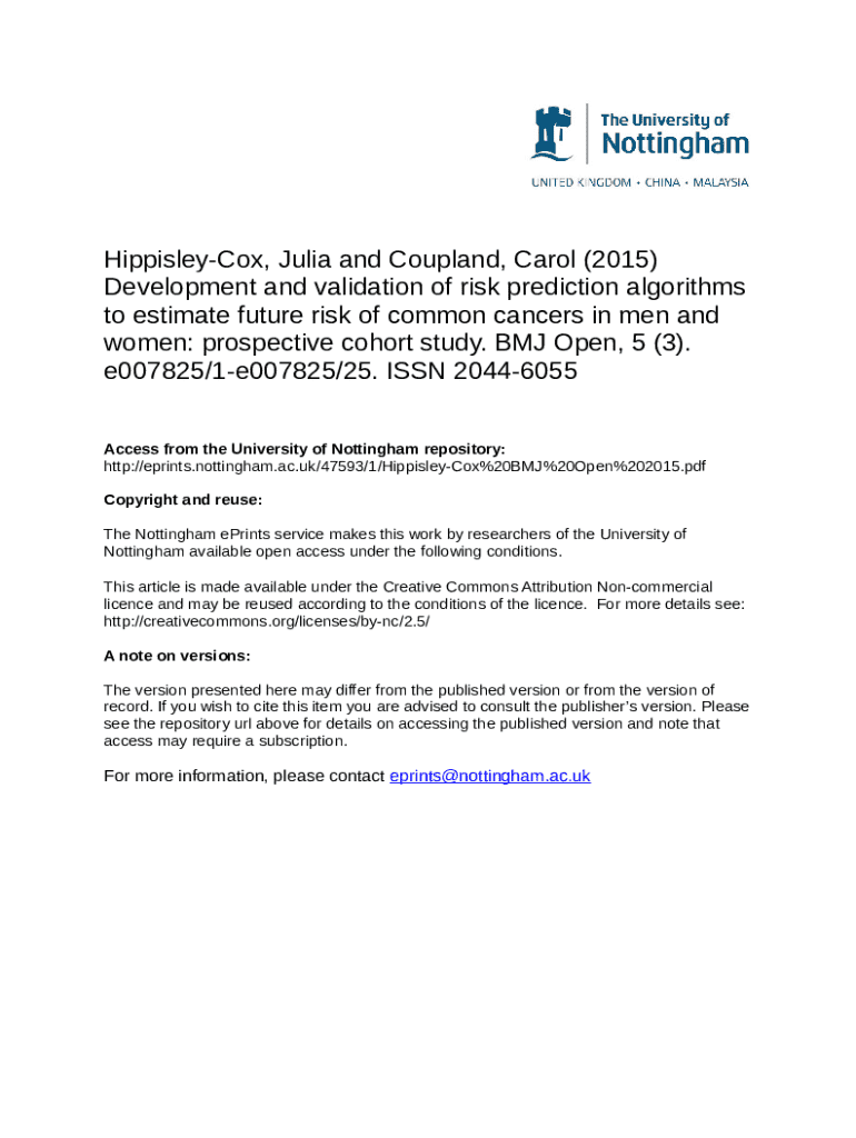 HippisleyCox, Julia and Coupland, Carol (2015) Development and validation of risk prediction algorithms to estimate future risk of common cancers in men and women: prospective cohort study. BMJ Open,