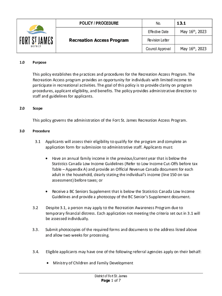 POLICY / PROCEDURENo. Effective DateRecreation Access ProgramMay 16th, 2023Revision Letter Council Approval1.013.1May 16th, 2023PurposeThis policy establishes the practices and procedures for the