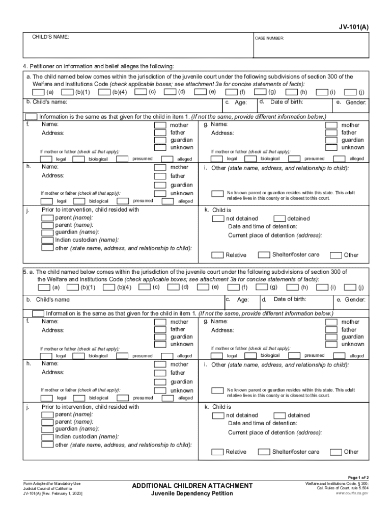 CA JV-101(A) S requires reporting the names, birth dates, and any pertinent custody or visitation details of the minor children.