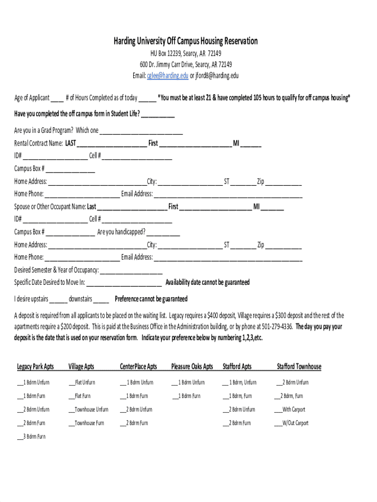 Harding University Off Campus Housing Reservation HU Box 12239, Searcy, AR 72149 600 Dr. Jimmy Carr Drive, Searcy, AR 72149 Email: cglee@harding.edu or jford8@harding.eduAge of Applicant ___ # of