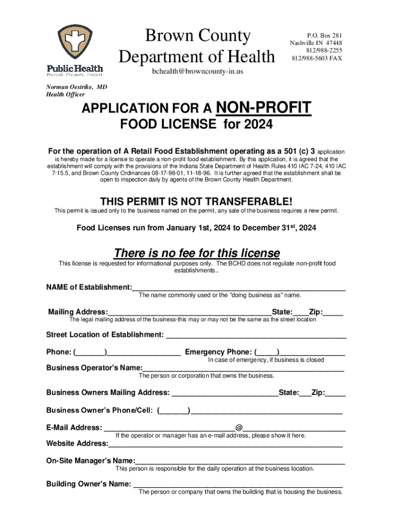 Brown County Department of Health. O. Box 281 Nashville IN 47448 812/9882255 812/9885603 FAXbchealth@browncountyin.us Norman Strike, MD Health OfficerAPPLICATION FOR A NONPROFIT FOOD LICENSE for 2024