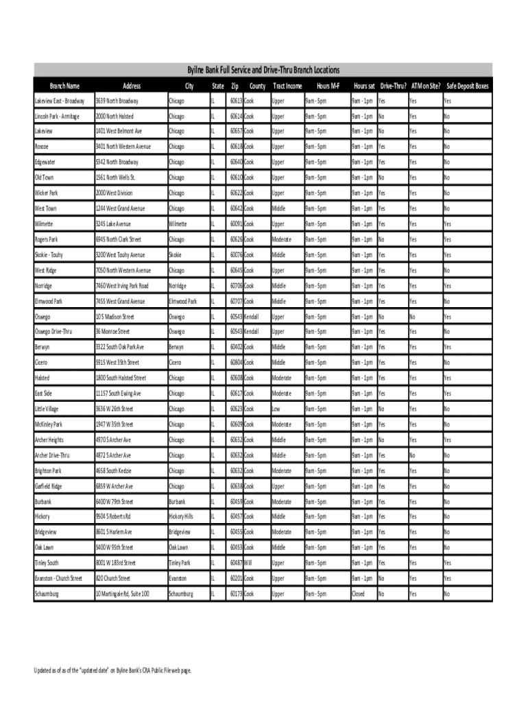 Byline Bank Full Service and Driver Branch Locations Branch NameAddressCityStateZipCountyTract Incomers Hours satDriveThru? ATM on Site? Safe Deposit BoxesLakeview East Broadway3639 North BroadwayChicagoIL60613
