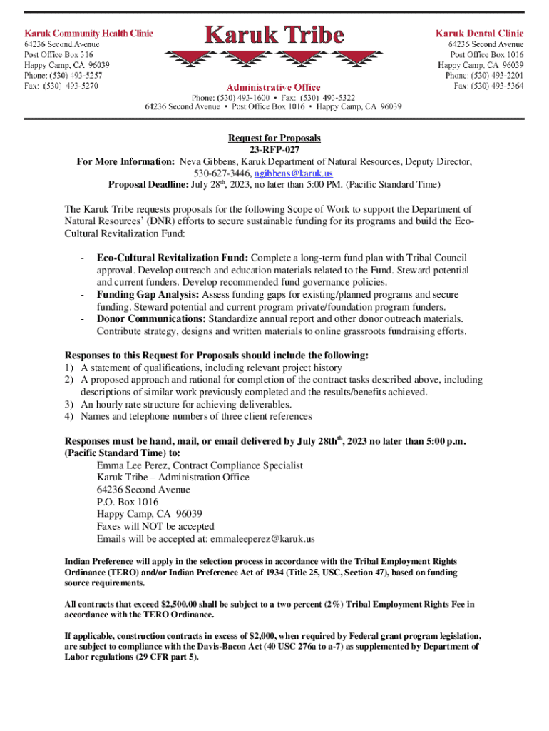Request for Proposals 23RFP027 For More Information: Neva Gibbens, Karuk Department of Natural Resources, Deputy Director, 5306273446, ngibbens@karuk.us Proposal Deadline: July 28th, 2023, no later