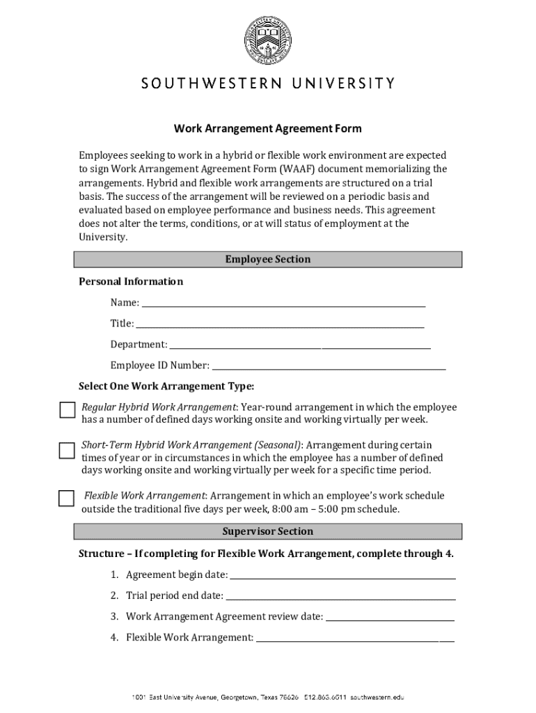 Work Arrangement Agreement Form Employees seeking to work in a hybrid or flexible work environment are expected to sign Work Arrangement Agreement Form (RAAF) document memorializing the arrangements.