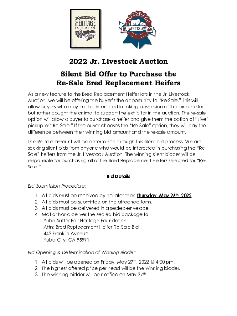 2022 Jr. Livestock Auction Silent Bid Offer to Purchase the ReSale Bred Replacement Heifers As a new feature to the Bred Replacement Heifer lots in the Jr. Livestock Auction, we will be offering the