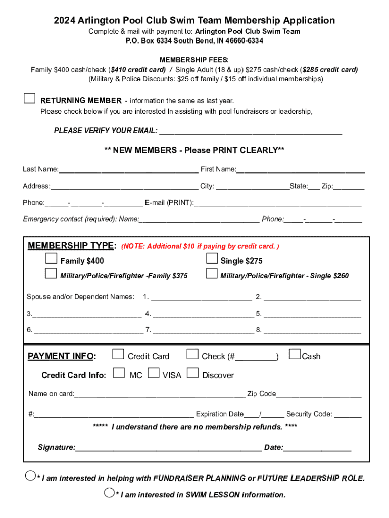 2024 Arlington Pool Club Swim Team Membership Application Complete & mail with payment to:Arlington Pool Club Swim Team P.O. Box 6334 South Bend, IN 466606334 EMBERSHIP FEES: M amily $400 cash/check