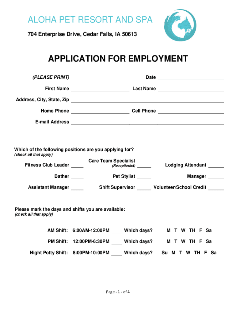 ALOHA PET RESORT AND SPA 704 Enterprise Drive, Cedar Falls, IA 50613APPLICATION FOR EMPLOYMENT (PLEASE PRINT)DateFirst NameLast NameAddress, City, State, Zip Home PhoneCell PhoneEmail AddressWhich