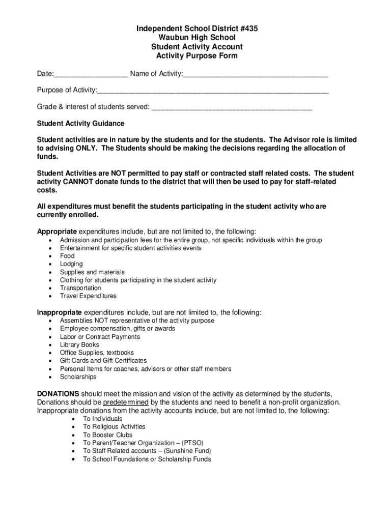 Independent School District #435 Waubun High School Student Activity Account Activity Purpose Form Date:___ Name of Activity:___ Purpose of Activity:___ Grade & interest of students served: ___ Student