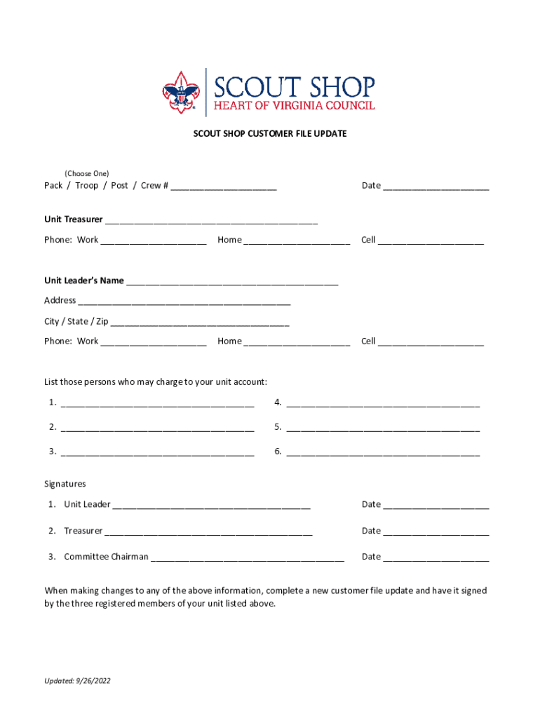 SCOUT SHOP CUSTOMER FILE UPDATE(Choose One)Pack / Troop / Post / Crew # ___Date ___Unit Treasurer ___ Phone: Work ___Home ___Cell ___Unit Leaders Name ___ Address ___ City / State / Zip ___ Phone: