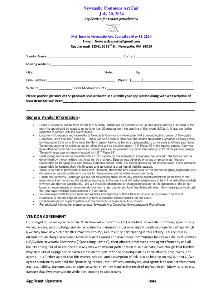Application for vendor participationMail form to Newcastle Arts Council by May 31, 2024,