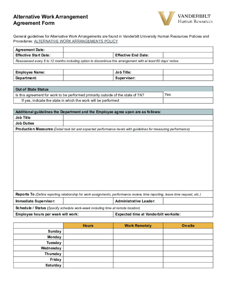 Alternative Work Arrangement Agreement Form General guidelines for Alternative Work Arrangements are found in Vanderbilt University Human Resources Policies and Procedures: ALTERNATIVE WORK ARRANGEMENTS
