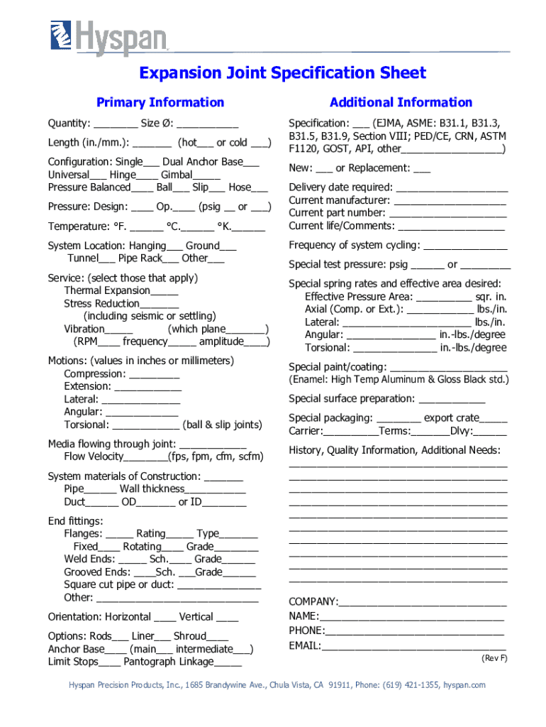 Expansion Joint Specification Sheet Primary Information Quantity: ___ Size : ___ Length (in./mm.): ___ (hot___ or cold ___) Configuration: Single___ Dual Anchor Base___ Universal___ Hinge___ Gimbals___