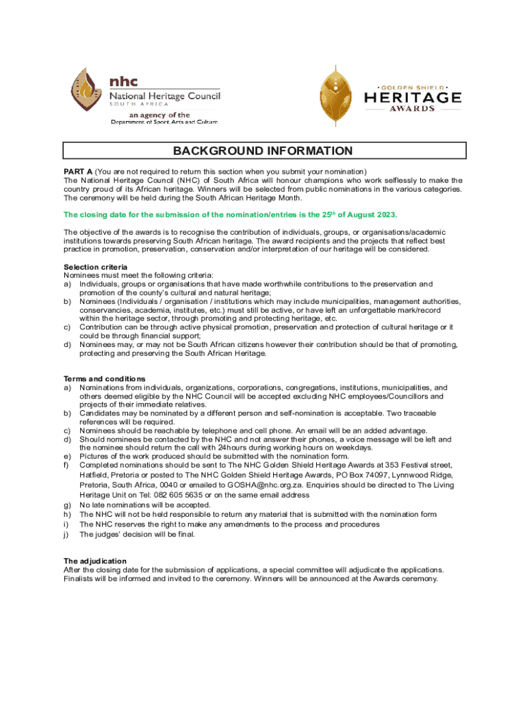 BACKGROUND INFORMATION PART A (You are not required to return this section when you submit your nomination) The National Heritage Council (NHC) of South Africa will honor champions who work selflessly