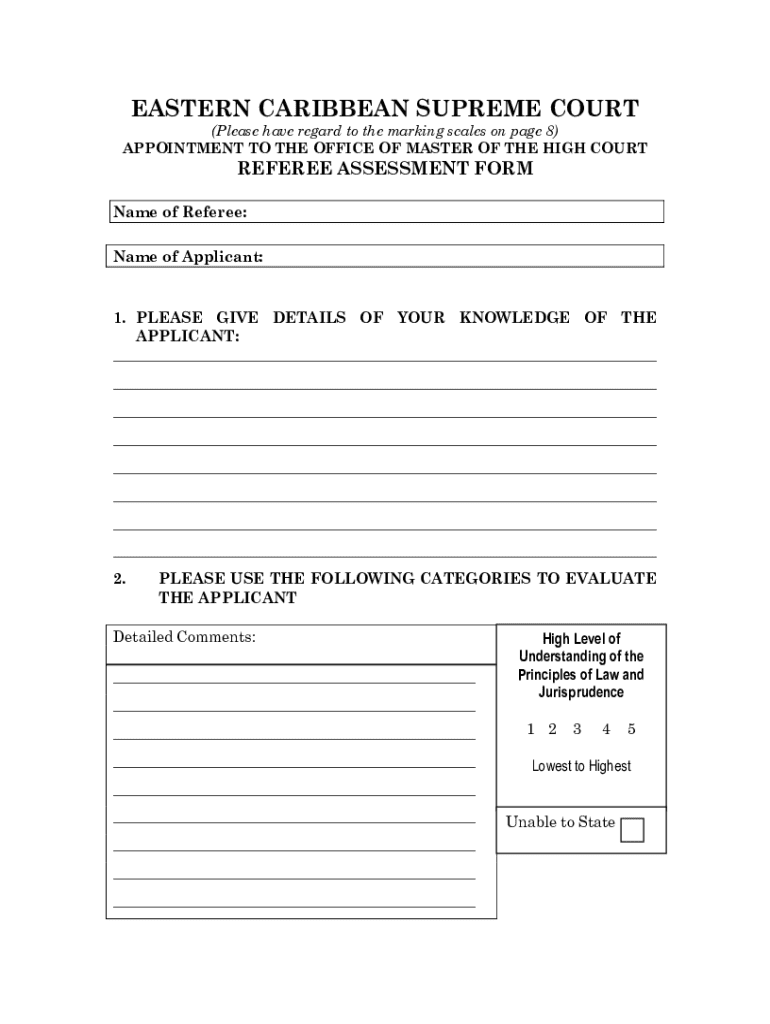 This document is a referee assessment form designed for evaluating applicants for the position of Master of the High Court. The form includes detailed categories such as understanding of law, judgment, analytical ability, decisiveness, communication skills, integrity, fairness, understanding of people and society, maturity, commitment, courtesy, and overall assessment.
