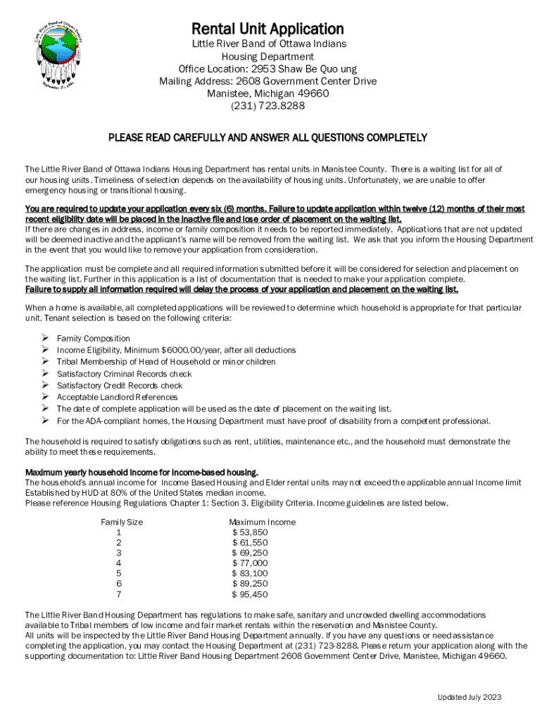 Rental Unit ApplicationLittle River Band of Ottawa Indians Housing Department Office Location: 2953 Shaw Be Quo ung Mailing Address: 2608 Government Center Drive Manistee, Michigan 49660 (231) 723.8288