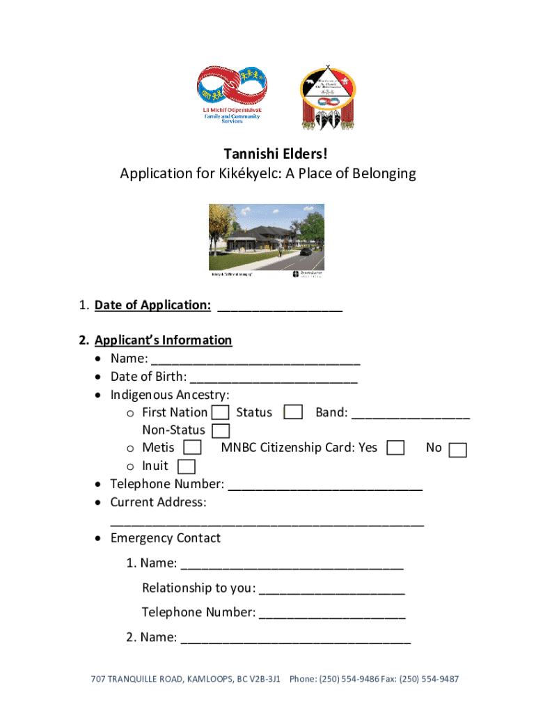 Tarnish Elders! Application for Mikkel: A Place of Belonging1. Date of Application: ___ 2. Applicants Information Name: ___ Date of Birth: ___ Indigenous Ancestry: o First Nation Status Band: ___