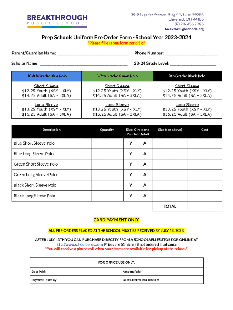 Prep Schools Uniform Pre Order Form School Year 20232024 *Please ll out one form per child*Parent/Guardian Name: ___Phone Number: ___Scholar Name: ___2324 Grade Level: ___K4th Grade: Blue Polo57th