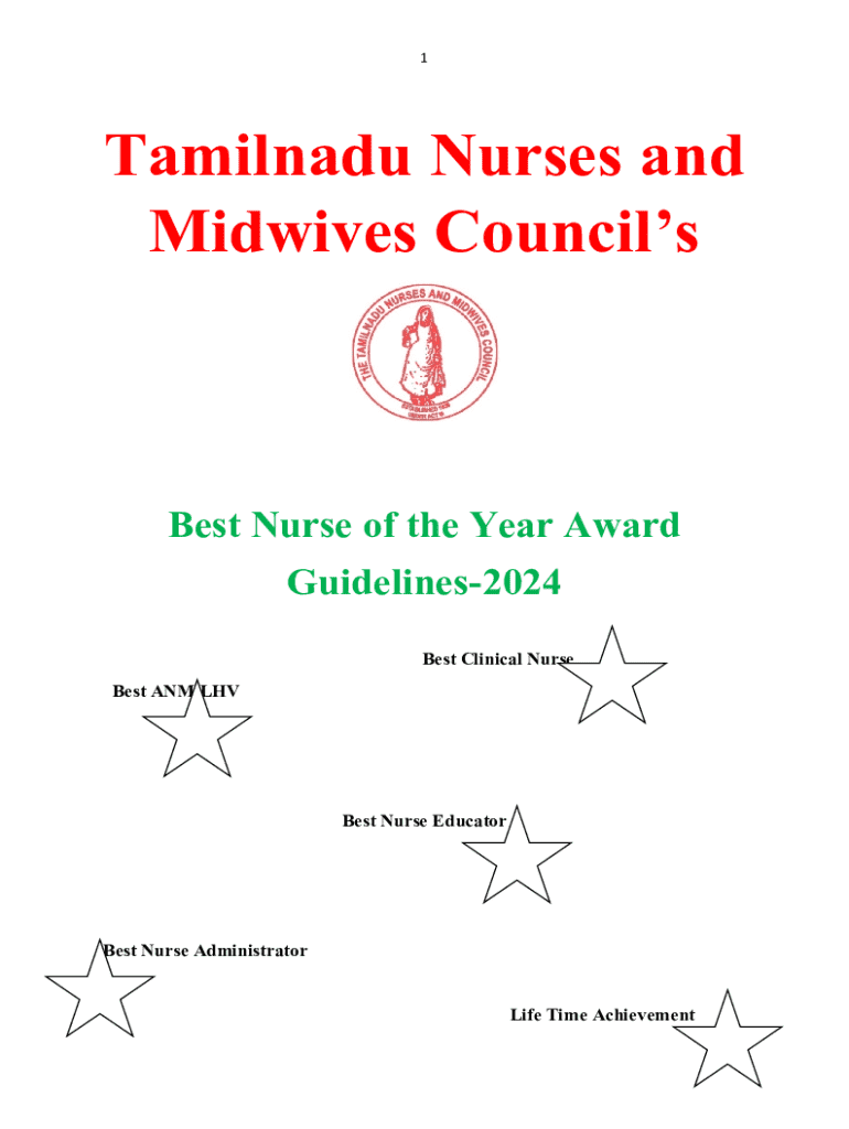 1Tamilnadu Nurses and Midwives Councils Best Nurse of the Year Award Guidelines2024 Best Clinical Nurse Best ANM/LHV Best Nurse Educator Best Nurse Administrator Life Time Achievement2Introduction