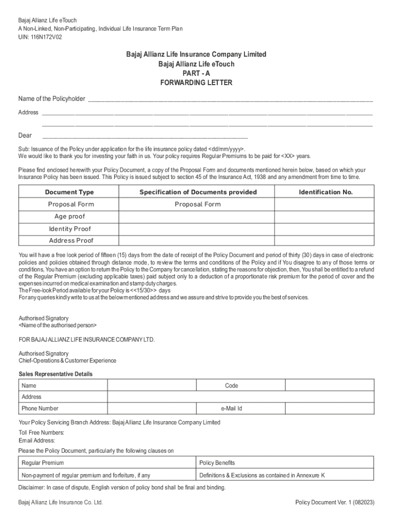Bajaj Allianz Life eTouch A NonLinked, NonParticipating, Individual Life Insurance Term Plan UIN: 116N172V02Bajaj Allianz Life Insurance Company Limited Bajaj Allianz Life eTouch PART A FORWARDING
