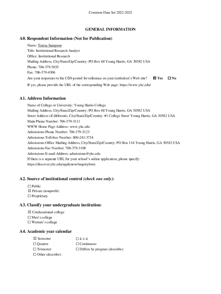 Common Data Set 20222023GENERAL INFORMATIONA0. Respondent Information (Not for Publication) Name: Teresa Sampson Title: Institutional Research Analyst Office: Institutional Research Mailing Address,