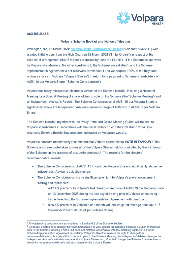 ASX RELEASE Vol para Scheme Booklet and Notice of Meeting Wellington, NZ, 13 March 2024: Vol para Health Technologies Limited (Vol para; ASX:VH) was granted initial orders from the High Court on 12