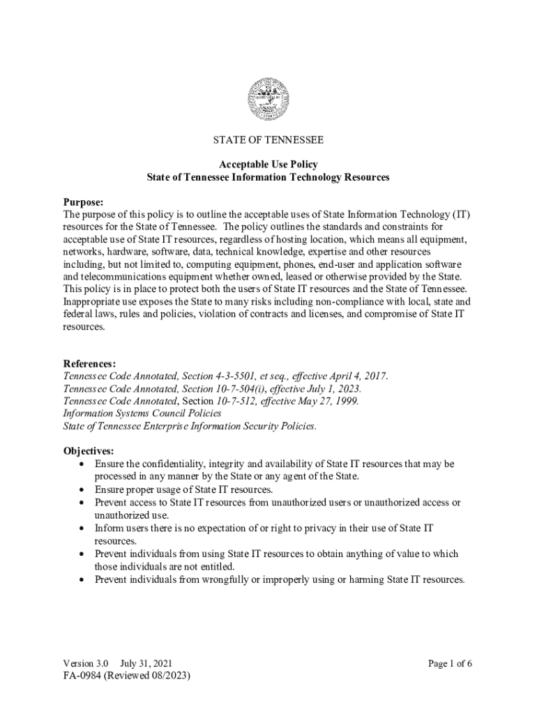 STATE OF TENNESSEE Acceptable Use Policy State of Tennessee Information Technology Resources Purpose: The purpose of this policy is to outline the acceptable uses of State Information Technology (IT)