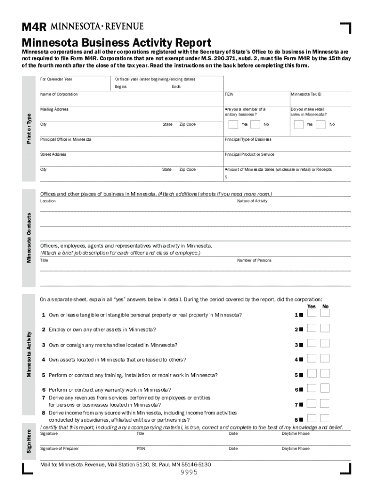 M4R Minnesota Business Activity ReportMinnesota corporations and all other corporations registered with the Secretary of States Office to do business in Minnesota are not required to file Form M4R.