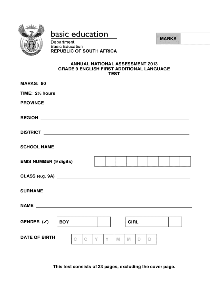 MARKSANNUAL NATIONAL ASSESSMENT 2013 GRADE 9 ENGLISH FIRST ADDITIONAL LANGUAGE TEST MARKS: 80 TIME: 2 hours PROVINCE ___REGION ___DISTRICT ___SCHOOL NAME ___EMIS NUMBER (9 digits)CLASS (e.g. 9A) ___SURNAME