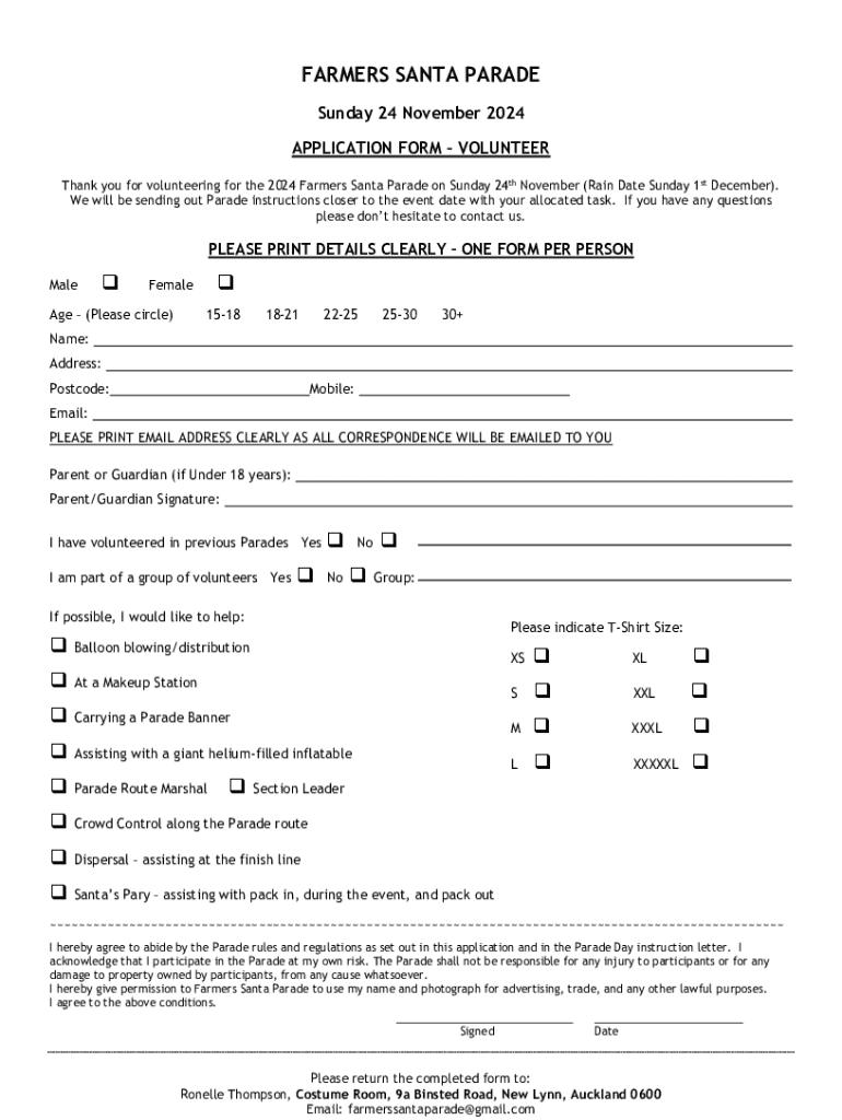 FARMERS SANTA PARADE Sunday 24 November 2024 APPLICATION FORM VOLUNTEER Thank you for volunteering for the 2024 Farmers Santa Parades on Sunday 24th November (Rain Date Sunday 1st December). We will