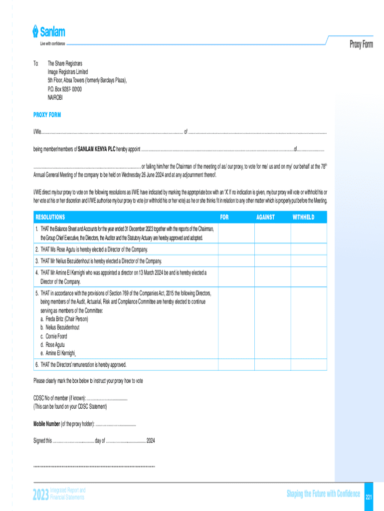 Proxy Form To:The Share Registrars Image Registrars Limited 5th Floor, BSA Towers (formerly Barclays Plaza), P.O. Box 9287 00100 NAIROBIPROXY FORM I/We of being member/members of SANTA KENYA PLC hereby