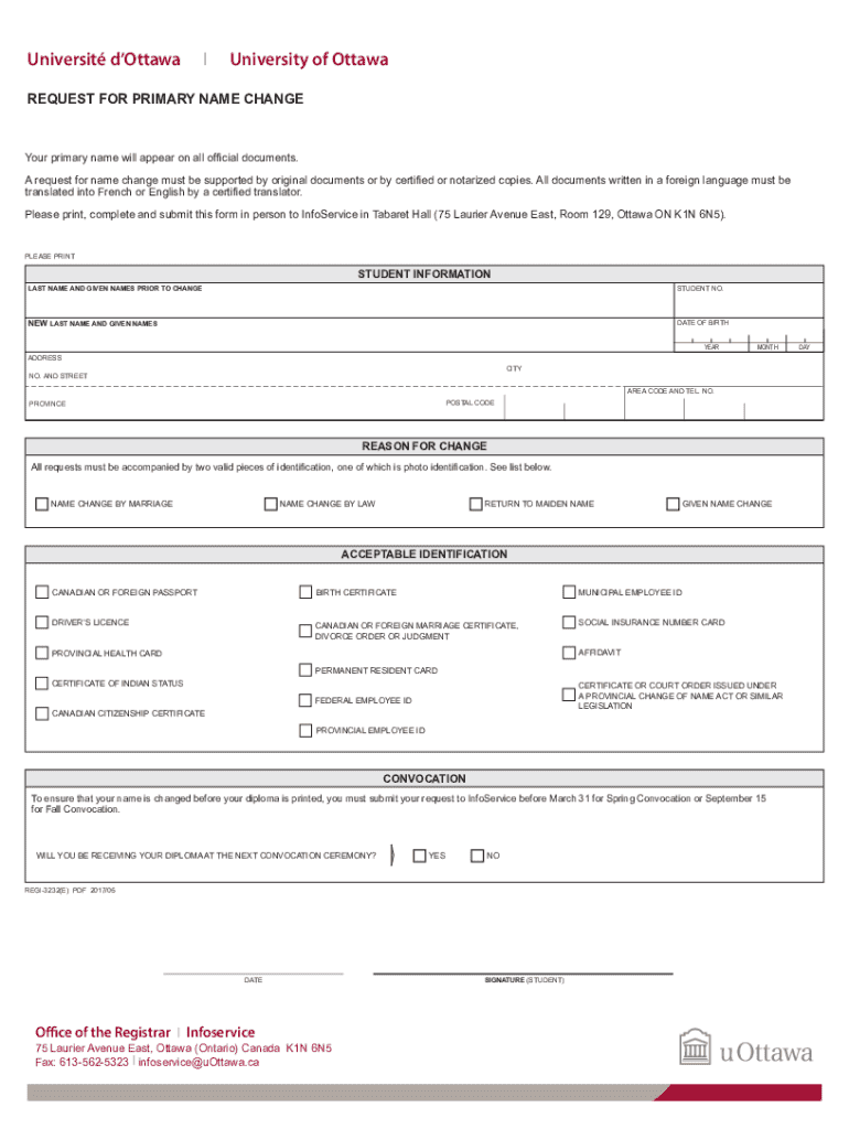 This document is a form used for requesting a primary name change at the University of Ottawa. It outlines the process for changing a student\'s primary name on official documents and the required supporting documents. The form also provides details on acceptable forms of identification for the name change request.