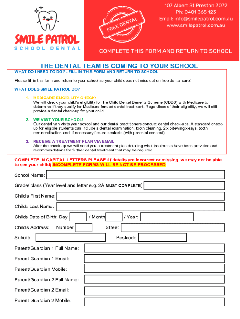 THE DENTAL TEAM IS COMING TO YOUR SCHOOL! WHAT DO I NEED TO DO? FILL IN THIS FORM AND RETURN TO SCHOOL Please fill in this form and return to your school, so your child does not miss out on free dental