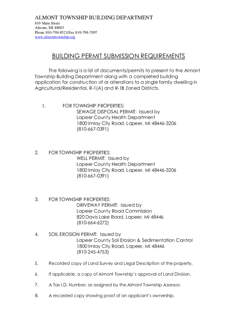 ALMONT TOWNSHIP BUILDING DEPARTMENT 819 Main Street Almont, MI 48003 Phone 8107988521/Fax 8107987097 www.almonttownship.orgBUILDING PERMIT SUBMISSION REQUIREMENTS The following is a list of documents/permits