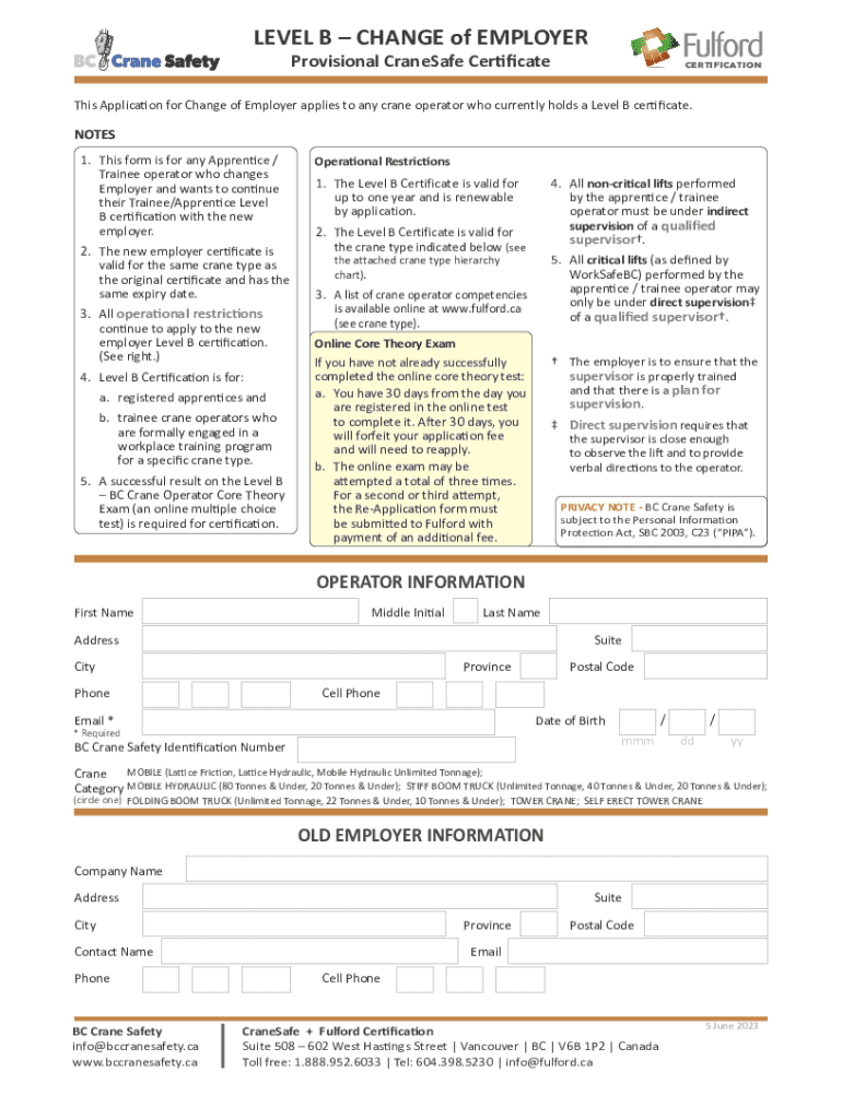 Provisional Cranes CertificateCERTIFICATIONThis Application for Change of Employer applies to any crane operator who currently holds a Level B certificate. NOTES