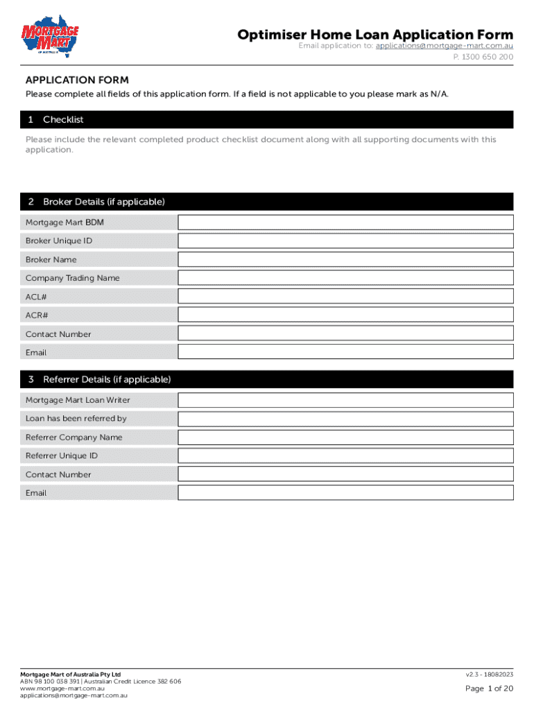 Optimiser Home Loan Application Form Email application to: applications@mortgagemart.com.auP. 1300 650 200APPLICATION FORM Please complete all fields of this application form. If a field is not applicable