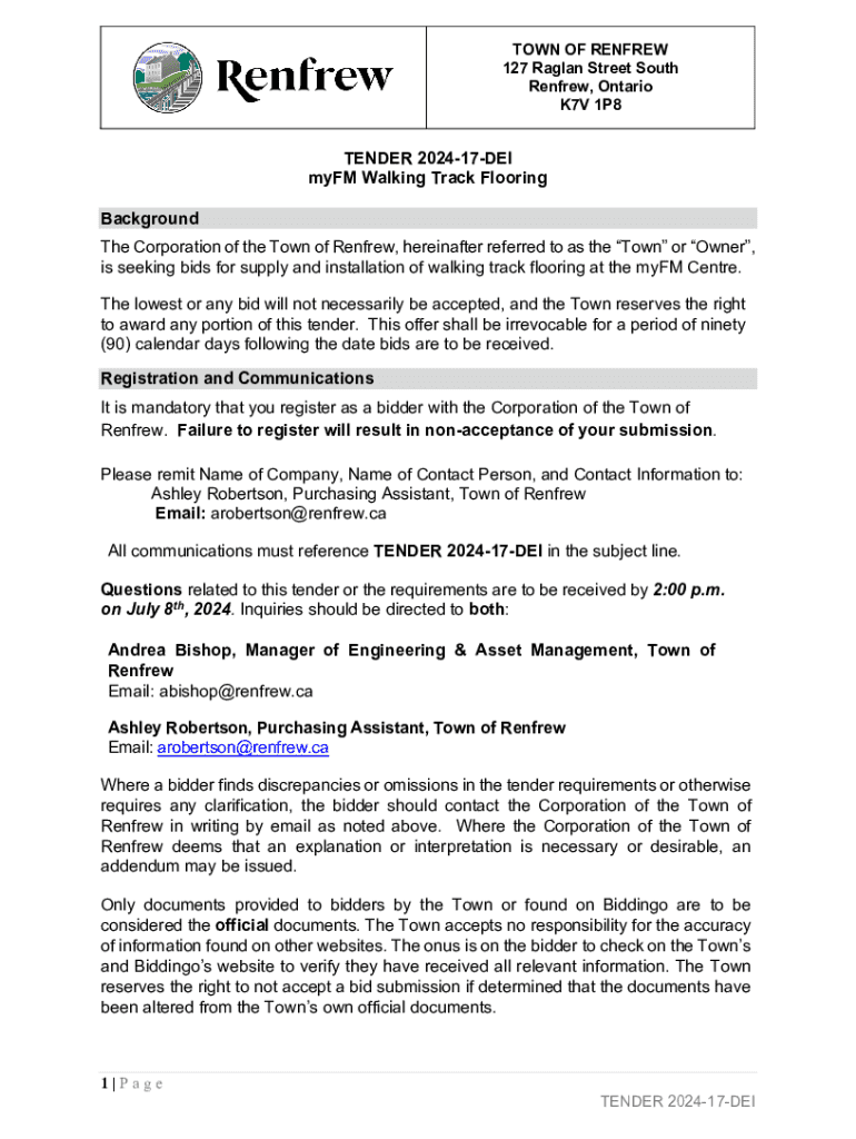 TOWN OF RENFREW 127 Raglan Street South Renfrew, Ontario K7V 1P8TENDER 202417DEI myFM Walking Track Flooring Background The Corporation of the Town of Renfrew, hereinafter referred to as the Town
