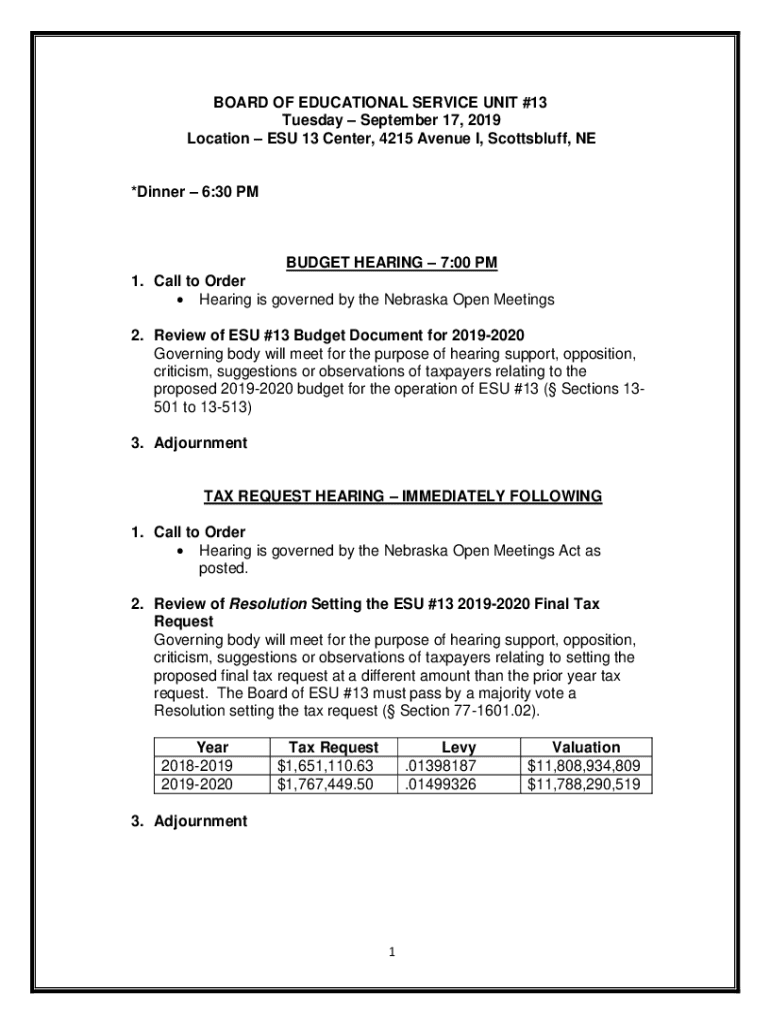 BOARD OF EDUCATIONAL SERVICE UNIT #13 Tuesday September 17, 2019 Location ESU 13 Center, 4215 Avenue I, Scottsbluff, NE *Dinner 6:30 PMBUDGET HEARING 7:00 PM 1. Call to Order Hearing is governed by