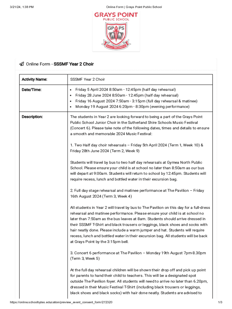 3/21/24, 1:38 PMOnline Form | Grays Point Public School Online Form SSSMF Year 2 Choir Activity Name: Date/Time:SSSMF Year 2 Choir Friday 5 April 2024 8:50am 12:45pm (half day rehearsal) Friday 28