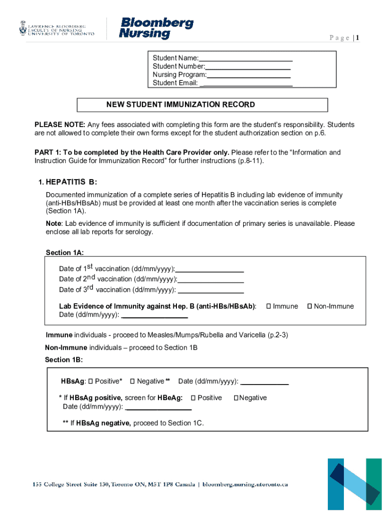 Page |1 Student Name: Student Number: Nursing Program: Student Email: _NEW STUDENT IMMUNIZATION RECORD PLEASE NOTE: Any fees associated with completing this form are the students responsibility. Students