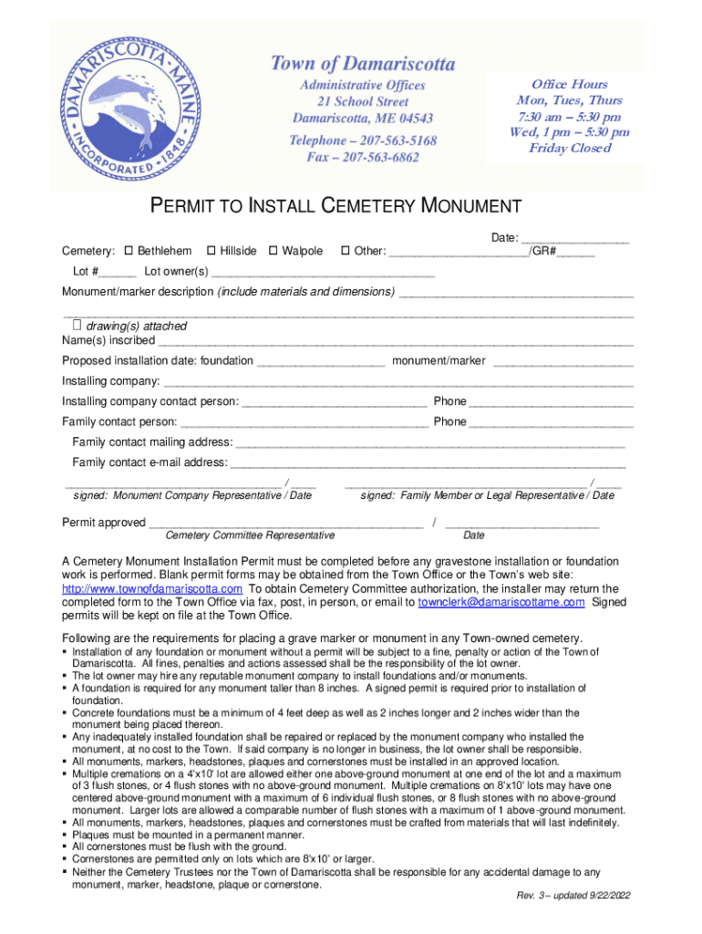 Office Hours Mon, Tues, Thurs 7:30 am 5:30 pm Wed, 1 pm 5:30 pm Friday ClosedPERMIT TO INSTALL CEMETERY MONUMENT Cemetery: Bethlehem Hillside WalpoleDate: ___ Other: ___/GR#___Lot #___ Lot owner(s)