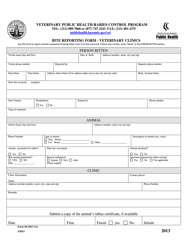 TEL: (213)-989-7060 or (877) 747-2243 FAX: (213) 481-2375 public health. lacounty.gov/vet. BITE REPORTING FORM VETERINARY CLINICS. Use this form to ...