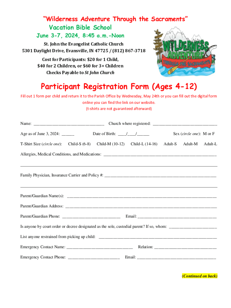 Wilderness Adventure Through the Sacraments Vacation Bible School June 37, 2024, 8:45 a.m. Noon St. John the Evangelist Catholic Church 5301 Daylight Drive, Evansville, IN 47725 / (812) 8673718 Cost
