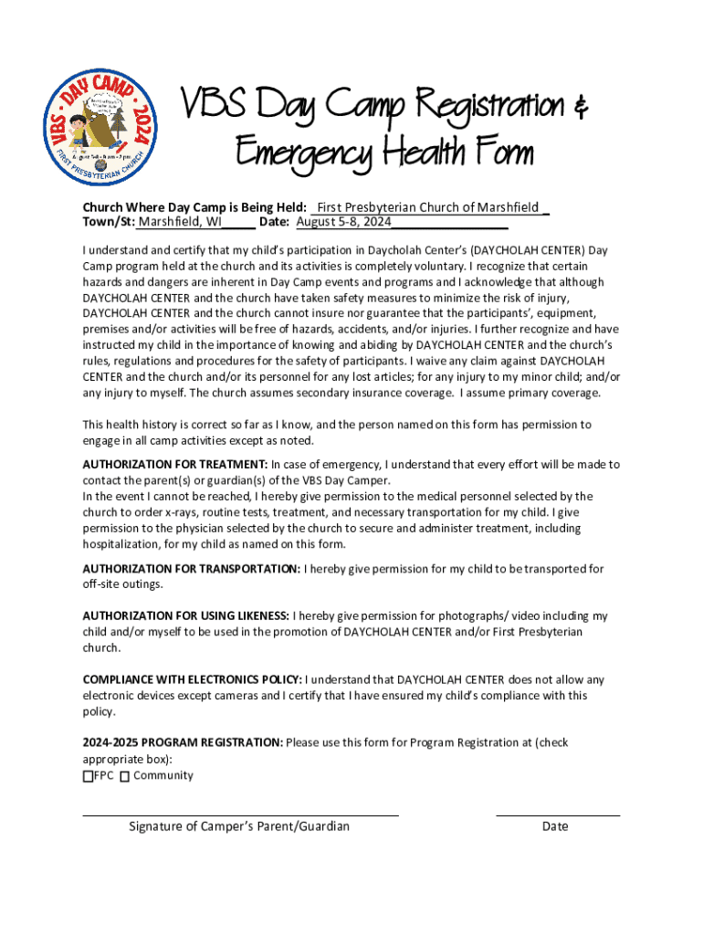 VBS Day Camp Registration & Emergency Health Form Church Where Day Camp is Being Held: First Presbyterian Church of Marshfield _ Town/St: Marshfield, WI___ Date: August 58, 2024___ I understand and